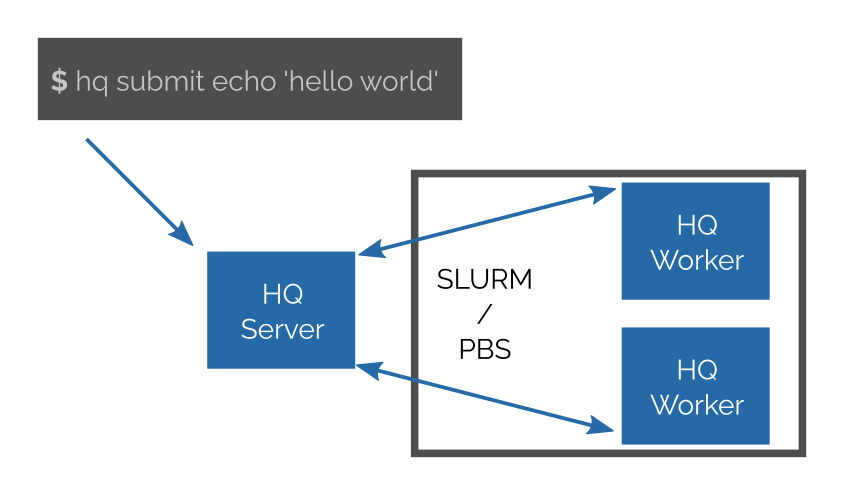 You start a HQ server somewhere (e.g. a login node or a cloud partition of a cluster). Then you can submit your jobs to the server. You may have hundreds of thousands of jobs; they may have various CPUs and other resource requirements.